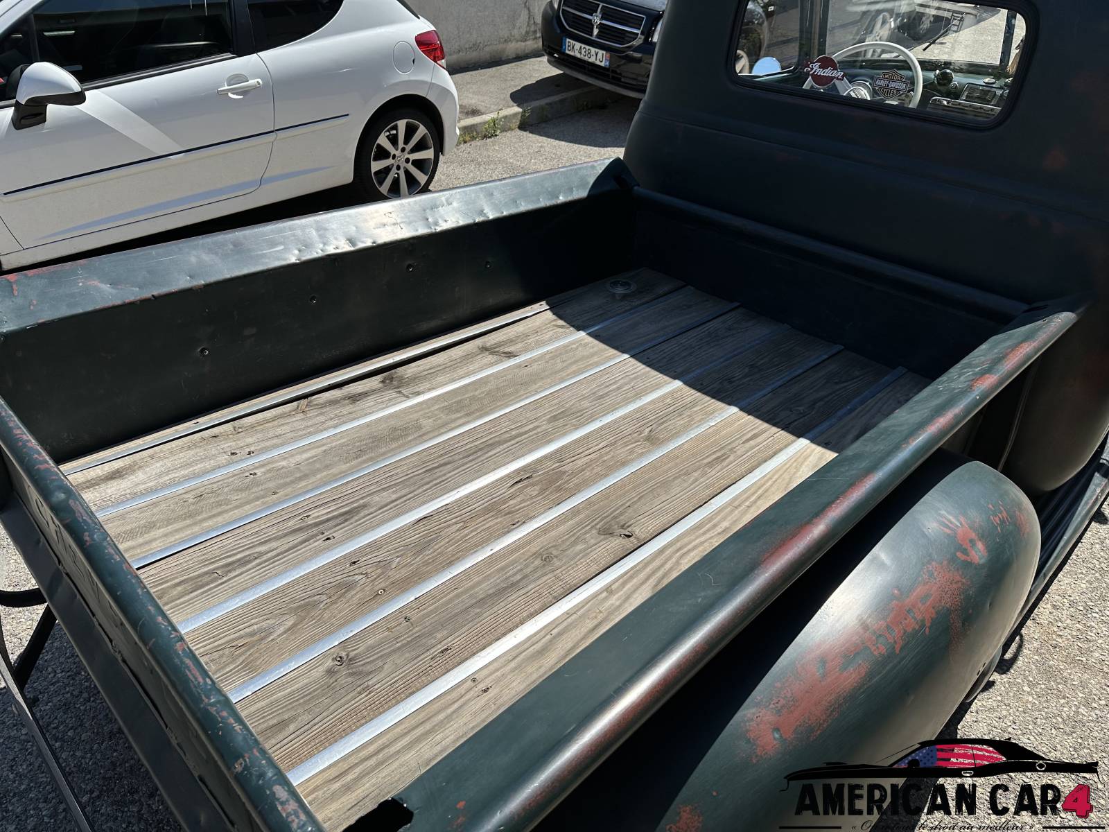 L'intérieur est neuf (sièges, tableau de bord, panneaux de portes ciel de toi et banquette ) les seuils d'entrées sont restés couleur rouille. Les jantes neuves sont des Smoothies en 16" chromées et la benne est en vieilles lattes de bois usées.